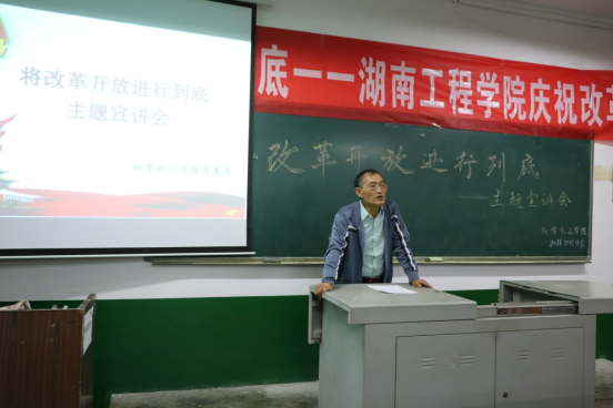 为了庆祝改革开放40周年,10月11日晚上7点,化学化工学院于四教209举行“将改革开放进行到底”主题宣讲会。本次宣讲会,由张建国副书记主讲,化学化工学院全体员工党员、预备党员以及员工干部到场,聆听了本次宣讲。