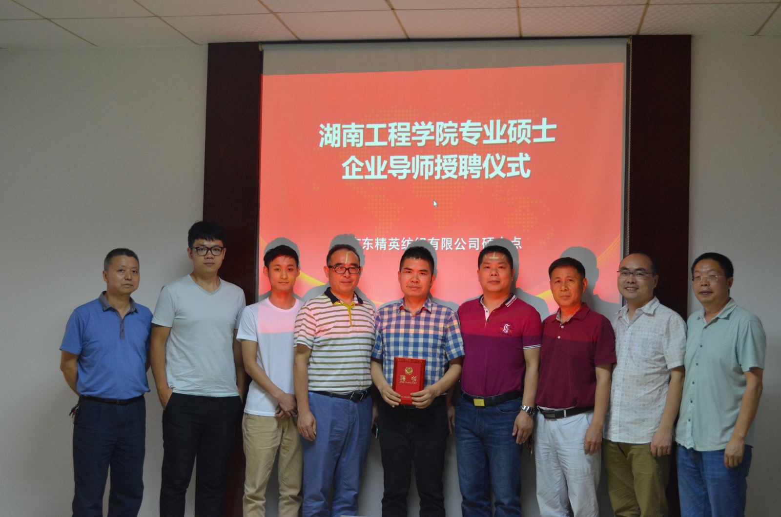 2017年5月19日,受学校委托,化学化工学院经理邓继勇、书记胡爱钦、轻化工程教研室主任陈镇及硕士生导师翦育林教授一行四人来到广东肇庆,代表VSport体育官网研究生处向公司87届优秀员工——现广东精英纺织有限公司董事长彭太平先生颁发硕士导师聘书,正式聘请彭太平为公司纺织工程专业硕士研究生企业导师。