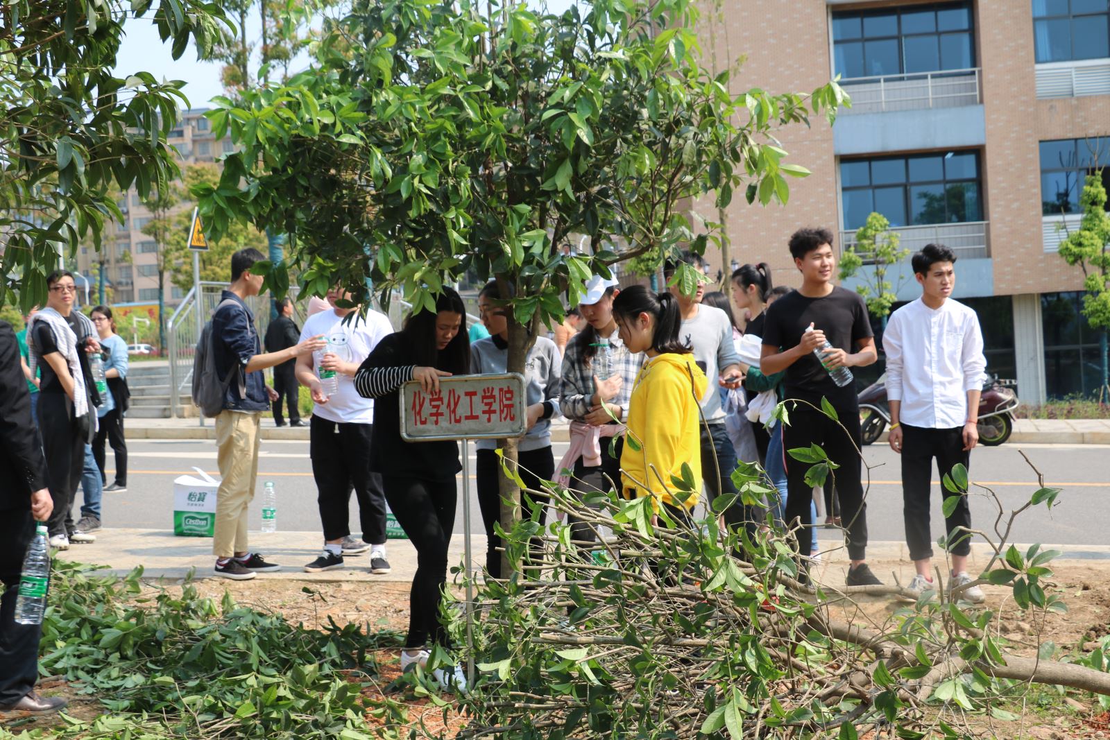 春回大地、芳草吐绿,4月14日下午2点30,化学化工学院副经理张何,学办老师吴菲、易苏、李娥君,老师代表、党员以及部分员工干部一同来到学校机械楼、电气楼北面空地开展义务植树活动。