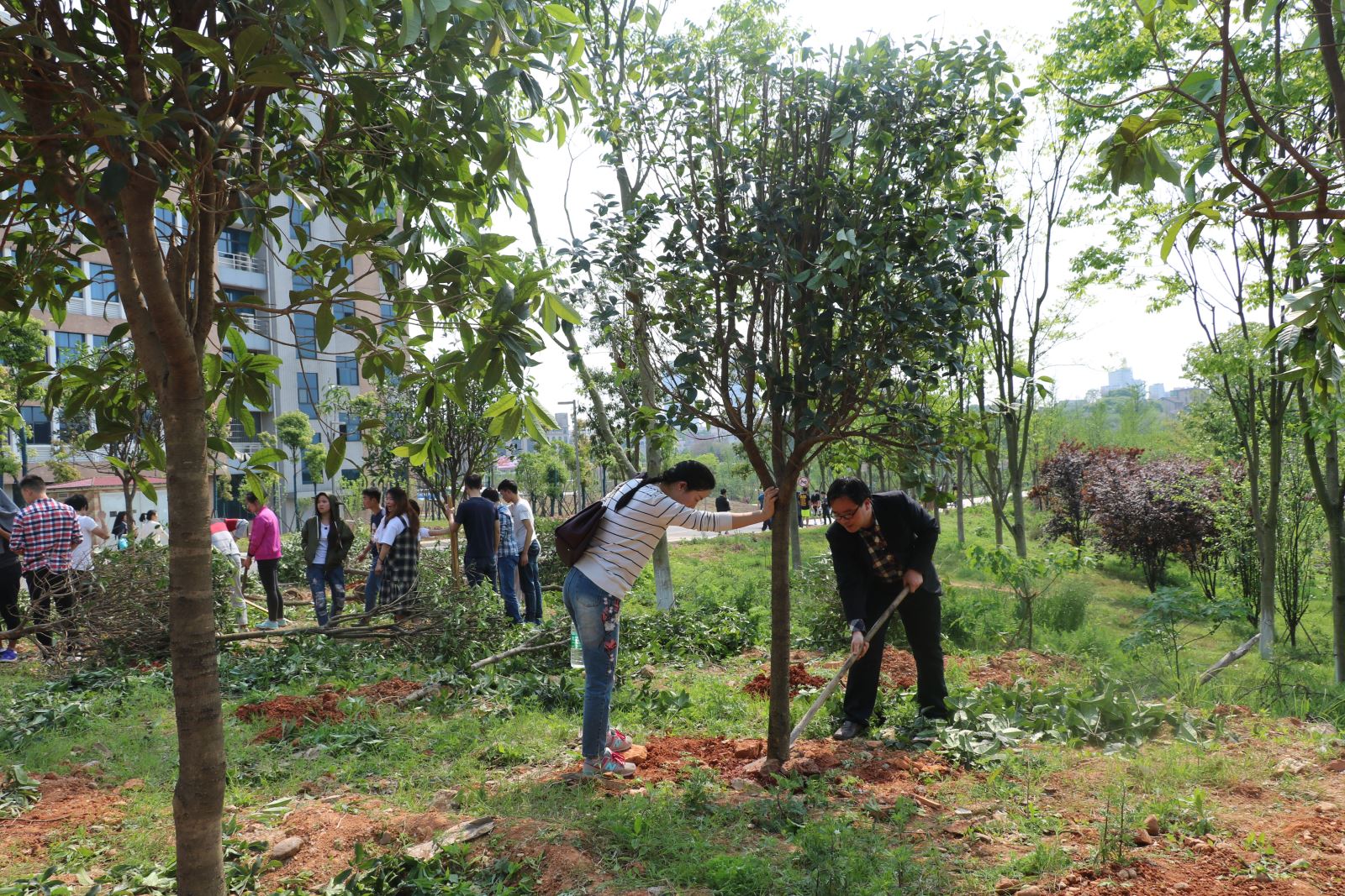 植树现场,师生们使用事先已经准备好的锄头、铲子埋头植树。大家互相配合,三五人一组,挖坑的挖坑,抬树的抬树,填土的填土,浇水的浇水,用心栽种着每一棵树,大家忙得不亦乐乎,一派热火朝天的景象。为了保证新栽树木的成活率,活动现场还安排了专业人士进行指导。