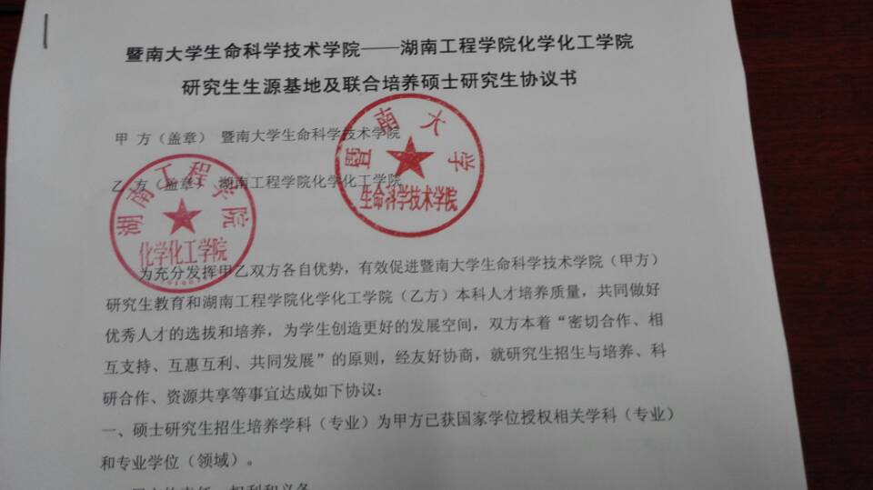 为充分发挥双方学院优势,有效促进暨南老员工命科学技术学院 (甲方) 研究生教育和VSport体育官网化学化工学院(乙方)本科人才培养质量,共同做好优秀人才的选拔和培养,为员工创造更好的发展空间,近日,化学化工学院邓继勇经理与暨南老员工命科学技术学院杨维东副经理就研究生招生培养,科研合作,资源共享等事宜达成协议并签订了《研究生生源基地及联合培养硕士研究生协议书》。经双方友好协商,暨南老员工命科学技术学院 每年向公司提供硕士研究生招生简章、宣传资料和近年硕士研究生招生考试相关科目真题,并安排专人为公司考生进行研究生招生政策宣讲、甲方公司产品方案以及甲方的研究方向等员工关心的内容;凡第一志愿报考暨南老员工命科学技术学院的公司考生,当其初试成绩达到规定复试分数线且复试合格,同等情况下优先录取公司考生,但因招生名额有限未被原报考专业录取,只要考生服从专业调剂,甲方有义务推荐乙方考生进行调剂。
