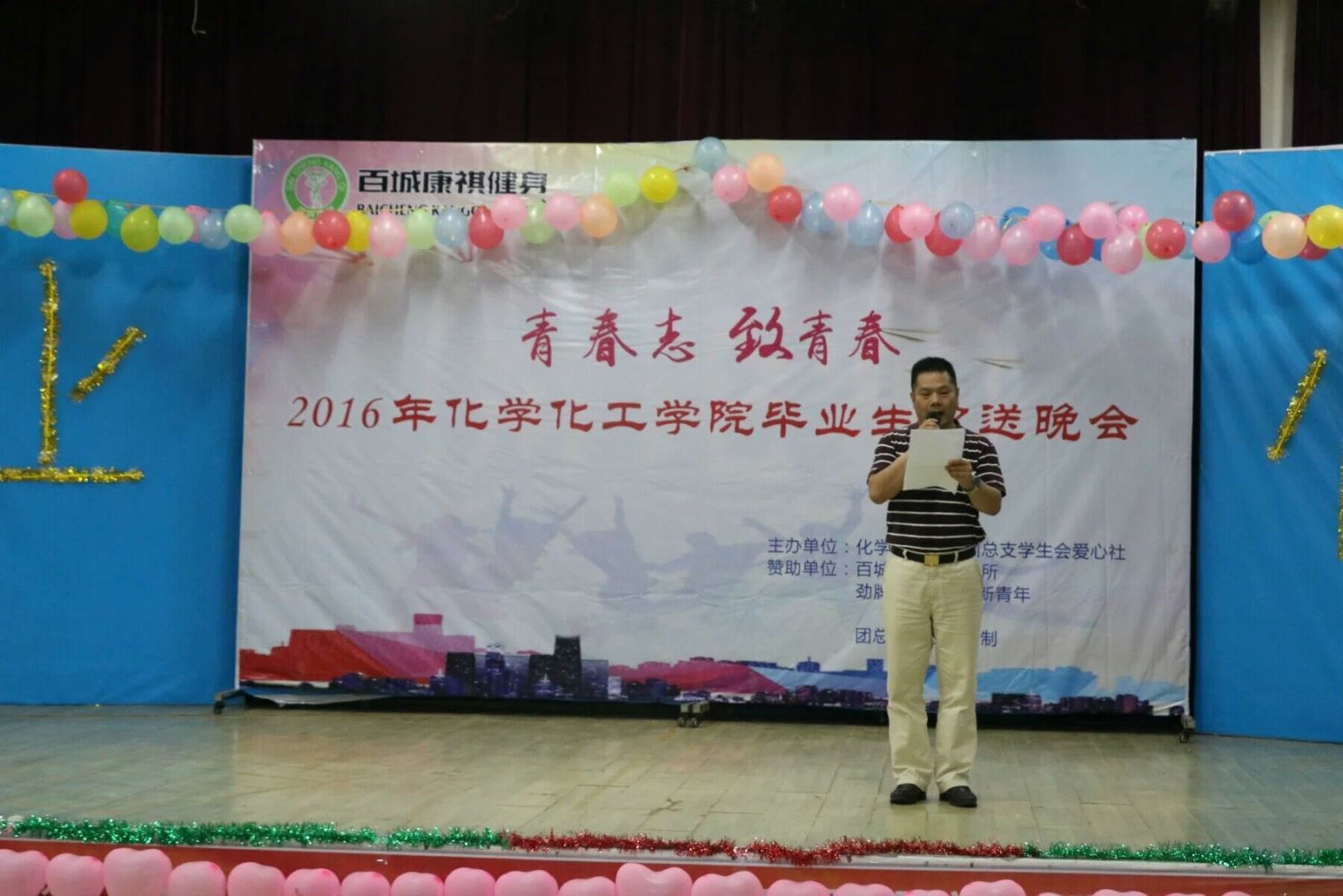 2016年6月11日晚7点30,VSport体育官网化学化工学院“青春志,致青春”毕业生欢送晚会在新校区明德二食堂三楼活动中心盛大举办。本次晚会历时约2小时,化学化工学院经理邓继勇,党总支书记胡爱钦、副书记张建国,学办主任吴菲及全体学工办老师应邀参加,现场座无虚席。